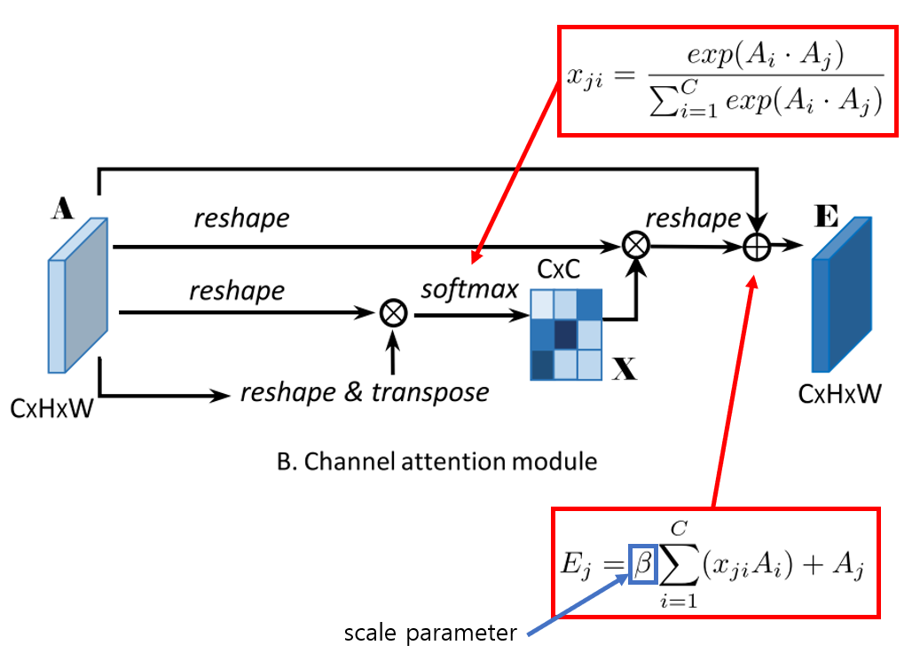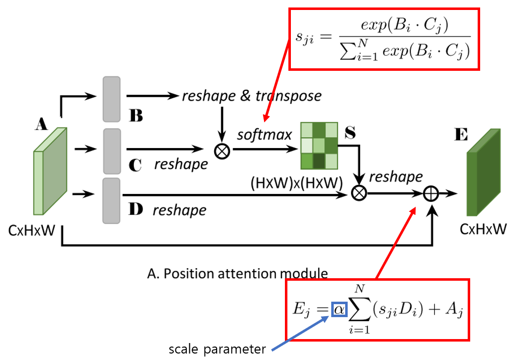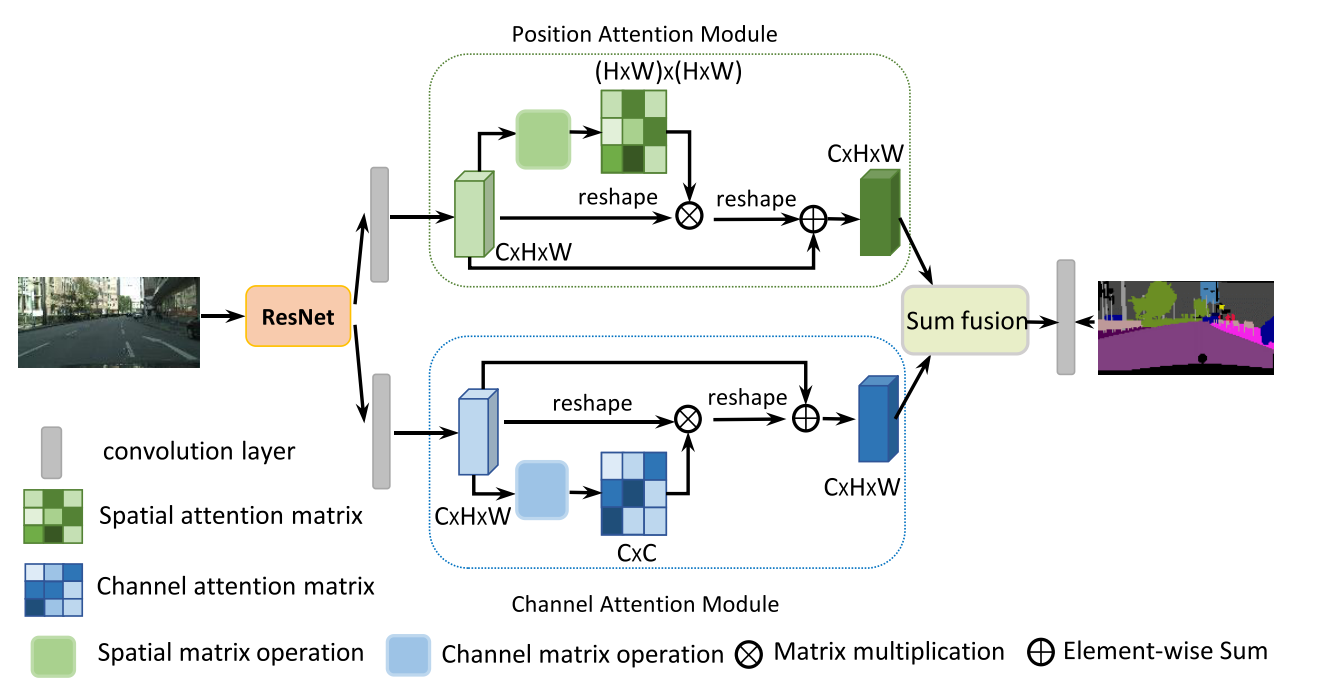 저자는 segmentation task를 위해 위와 같은 구조를 제안한다. Position Attenion Module은 non-local block과 거의 유사하다. 대신 논문은 채널 간의 관계를 구하기 위해 Channel Attention Module을 추가했다.