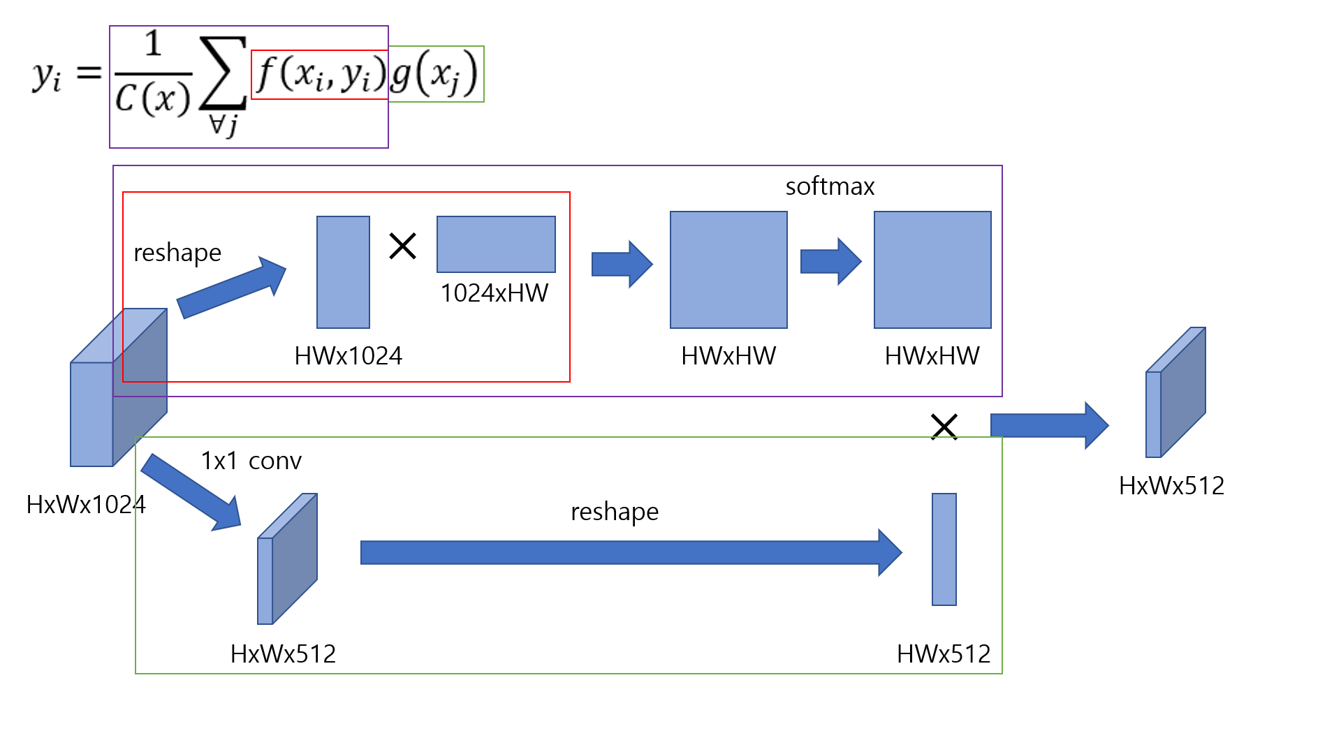 $f\left(x_i,y_i\right)$ 부분이 바로 두 위치의 관계를 계산하는 부분인데, 여기선 두 위치의 관계를 각 위치의 채널 축 값 간의 dot product로 정의하였다. 전체 과정을 그림으로 표현하면 다음과 같다.