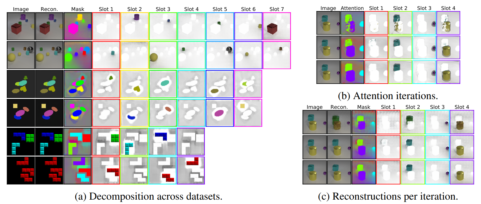 import torch from slot_attention import SlotAttention slot_attn = SlotAttention( num_slots = 5, dim = 512, iters = 3 # iterations of attention, defaults to 3 ) inputs = torch.randn(2, 1024, 512) slot_attn(inputs) # (2, 5, 512)논문은 object-centric learning 기반의 세그멘테이션 작업을 수행한다. 결과는 아래와 같다.
