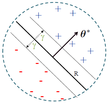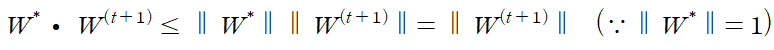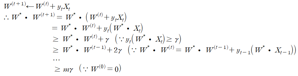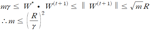 이 부등식을 mistake bounds라고 하며 perceptron에서는 데이터 수와 관계없이 mistake의 수가 결정된다는 상당히 의미 있는 결론을 도출하게 된다. 이제 mistake bounds를 유도해보자. 우리는 앞서 설명한 weight의 업데이트 공식에서