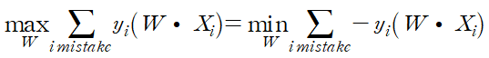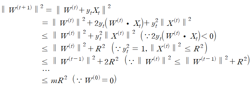 이 부등식을 mistake bounds라고 하며 perceptron에서는 데이터 수와 관계없이 mistake의 수가 결정된다는 상당히 의미 있는 결론을 도출하게 된다. 이제 mistake bounds를 유도해보자. 우리는 앞서 설명한 weight의 업데이트 공식에서