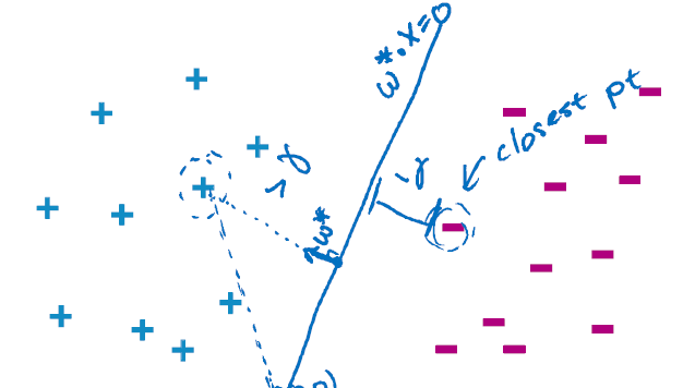 여기서 감마는 데이터중 가장 가까운 margin을 의미하며 따라서 모든 데이터의 margin은 감마보다 크다. 이를 수식으로 표현하면