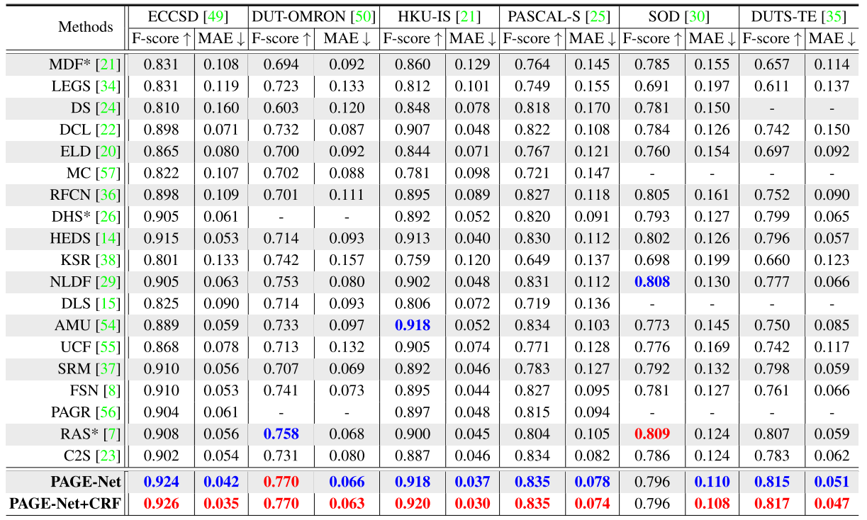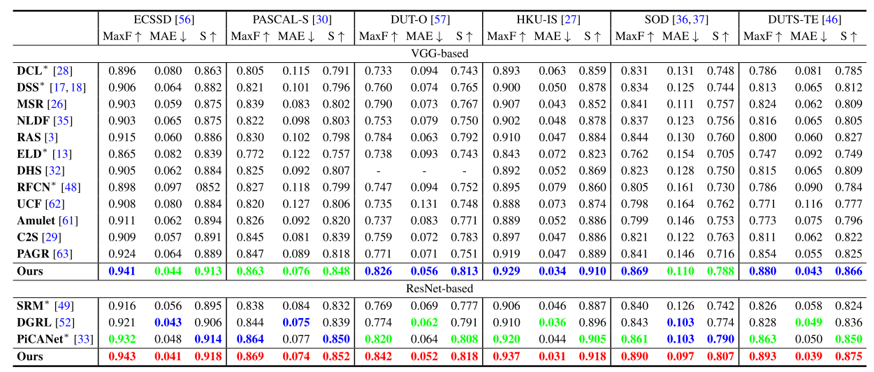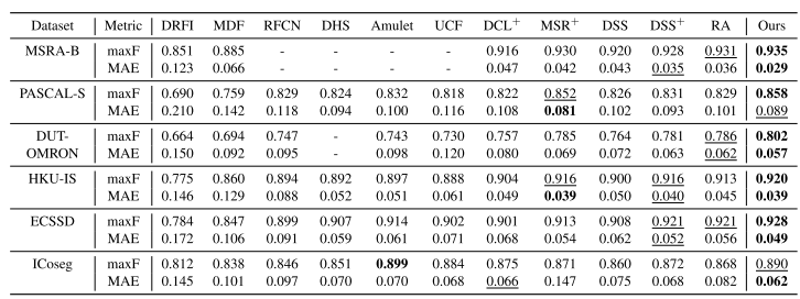 - 데이터셋은 ECSSD, PASCAL-S, DUT-O, HKU-IS, SOD, DUTS-TE 사용