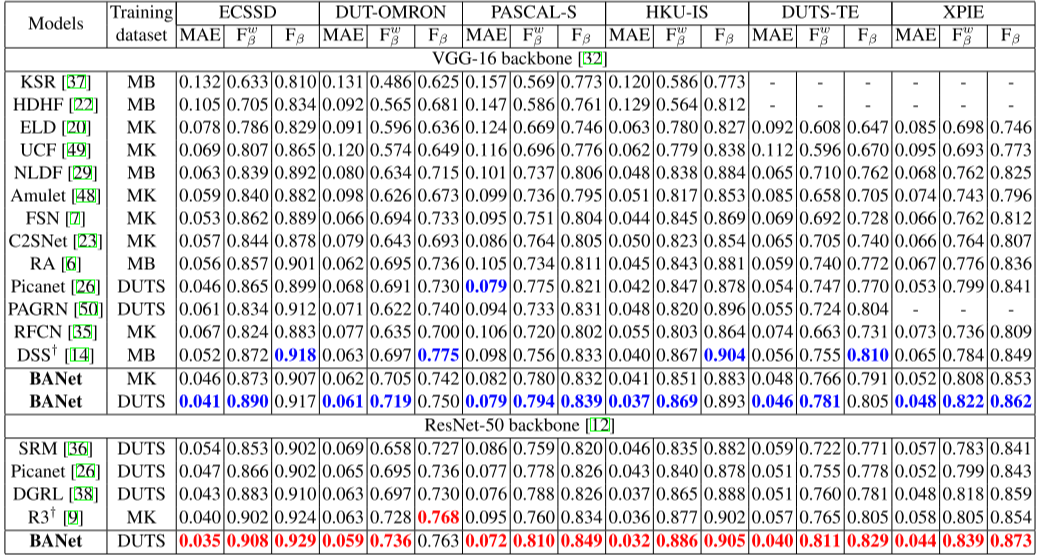 - 데이터셋은 ECSSD, DUT-OMRON, PASCAL-S, HKU-IS, DUTS-TE, XPIE 사용