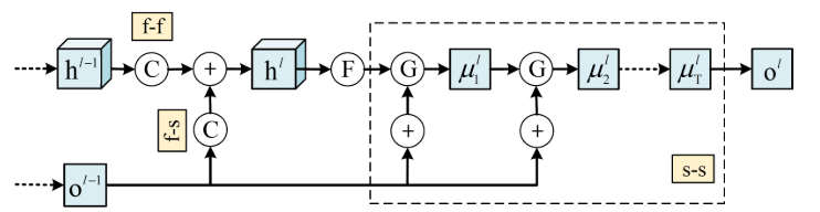 - 이때 $E= \sum _ { i } ^ { } \phi _ { h } \left ( h _ { i } ^ { l } ,f _ { i } ^ { l } \right ) + \sum _ { i } ^ { } \phi _ { o } \left ( s _ { i } ^ { l } ,o _ { i } ^ { l } \right ) + \sum _ { i \neq j } ^ { } \psi _ { h } \left ( h _ { i } ^ { l } ,h _ { j } ^ { l-1 } \right ) + \psi _ { hs } \sum _ { i } ^ { } \phi _ { hs } \left ( h _ { i } ^ { l } ,o _ { i } ^ { l-1 } \right ) + \sum _ { i \neq j } ^ { } \psi _ { o } \left ( o _ { i } ^ { l } ,o _ { j } ^ { l } \right )$