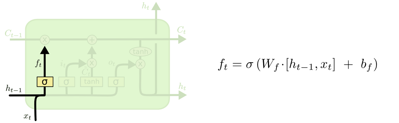 LSTM의 첫 번째 단계는 cell state에서 어떤 정보를 버릴지 결정하는 것이다. 이 결정은 "forget gate layer"라고 불리는 sigmoid layer에 의해 이루어진다. h_t-1과 x_t를 보고, cell state C_t-1의 각 숫자에 대해 0과 1 사이의 숫자를 출력한다. 1은 "이것을 유지하는 것"을 나타내고, 0은 "이것을 없애는 것"을 나타낸다.