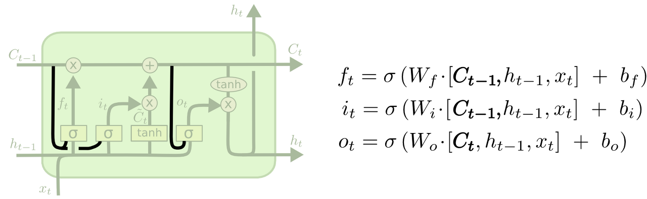 위의 그림은 모든 gate에 peephole을 추가하지만 많은 논문은 일부만 peephole을 제공한다.
