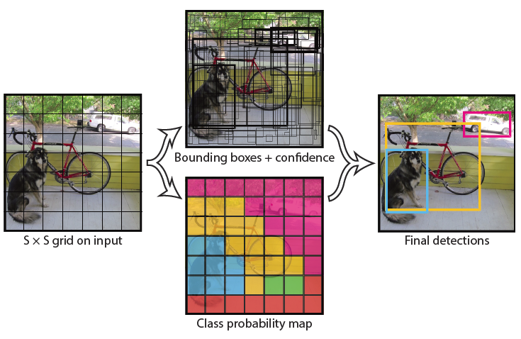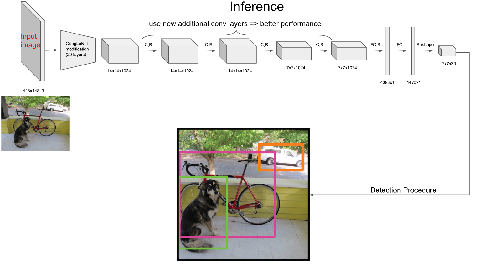 R-CNN (First, extract region proposals; Then detect object for each region proposals) 그에 비해 YOLO(You Only Look Once)는 이미지를 한 번 보는 것으로 object의 종류와 위치를 추측한다. single convolutional network를 통해 multiple bounding box에 대한 class probablility를 계산하는 방식이다.