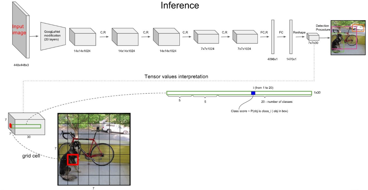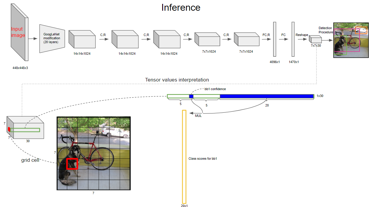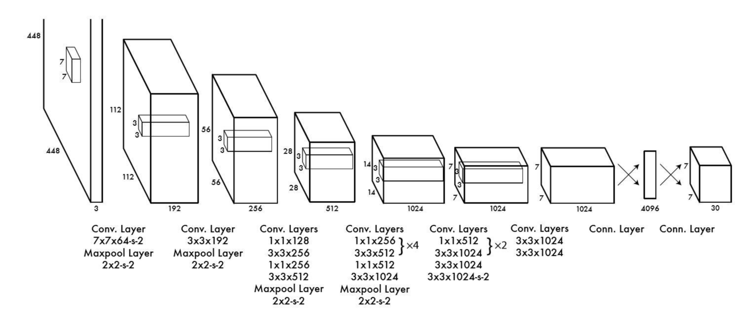 YOLO의 구조이다. Network architecture는 GoogLeNet for image classification 모델을 기반으로 한다. 좀 더 직관적으로 표현하면 아래와 같다.
