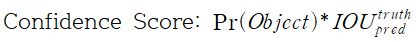 Confidence score은 해당 grid cell에 object가 존재할 확률과 예측된 bounding box가 실제 bounding box와 일치하는 정도인 IOU(intersection over union) 값을 곱해서 계산된다. Grid cell에 object가 없다면 confidence score는 0이 된다.