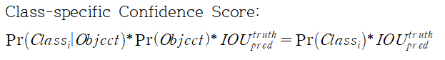 마지막으로 conditional class probability와 bounding box의 confidence score를 곱하여 class-specific confidence score를 계산한다. 아래와 같이 표현이 가능하다.