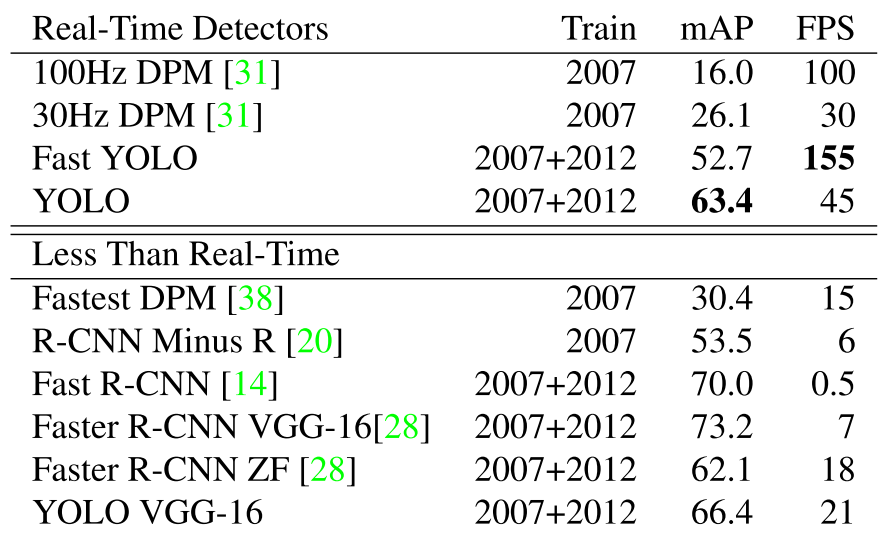 mAP and FPS Results (VOC 2007) 다른 real-time object detect 알고리즘에 비해 높은 mAP를 보여준다. Fast YOLO의 경우 가장 빠른 속도를 보여준다.