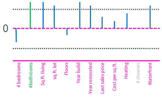 bathroom의 개수와 shower의 개수는 모두 threshold 이하이지만 비슷한 weight를 가짐을 알 수 있다. 집값을 예측하는데 bathroom의 개수는 분명히 중요한 feature이지만 여기서는 고려되지 못했다. 사실 bathroom의 개수와 shower의 개수는 밀접한 관련이 있다. bathroom에는 반드시 shower가 존재할 테니 동일한 feature라고 봐도 무방하다. 이러한 중복된 feature가 regularization을 이용한 feature selection의 큰 문제로 작용한다. 만약 shower라는 feature를 제거했다면 아래와 같이 bathroom은 정상적으로 selection이 되었을 것이다. (모델이 선형적이기 때문이다.)
