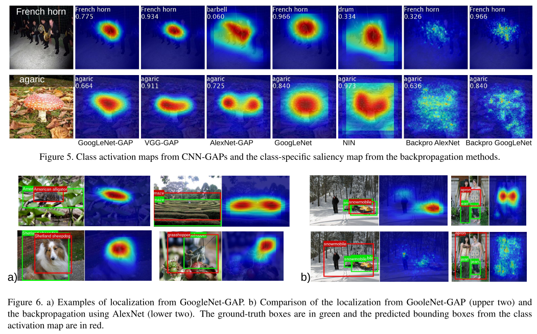 논문에서는 CAM을 Weakly-supervised Object Localization으로 활용한다. 유명한 CNN모델인 AlexNet, VGGnet, GoogLeNet에 FC layer를 빼고 결과 나오기 직전에 GAP을 넣어 CAM을 사용할 수 있게 모델을 수정했다. 이 모델을 classification 바탕으로 학습시킨 후 CAM을 뽑아내 상위 20% 값을 segment한 후 가장 큰 덩어리를 커버하는 bounding box를 만들었다. 이렇게 하여 classification 트레이닝과 데이터셋으로 object localization을 할 수 있었다.