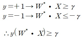 여기서 감마는 데이터중 가장 가까운 margin을 의미하며 따라서 모든 데이터의 margin은 감마보다 크다. 이를 수식으로 표현하면