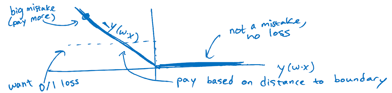 또한 gradient decent를 방식을 이용하기 위해 loss function이 필요한데, perceptron의 loss function은 아래와 같이 hinge loss(생긴 모양새 때문에 이름 붙여졌다.)로 표현된다.