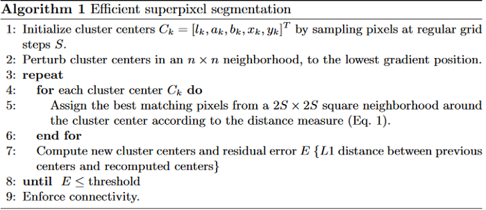 픽셀을 가장 가까운 클러스터 중심과 연결하고 클러스터 중심을 다시 계산하는 과정은 이 과정이 수렴될 때까지 반복된다. SLIC 알고리즘은 다음과 같이 요약할 수 있다.