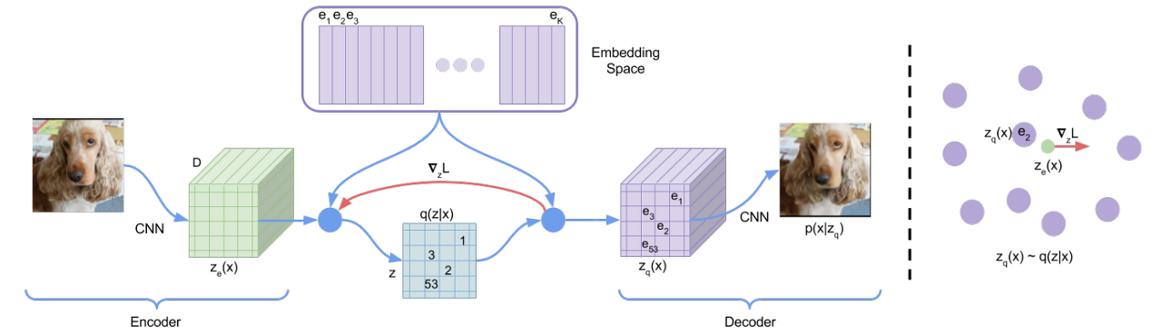 첫 번째 항은 reconstruction loss로 위에서 설명한 estimator를 통해 decoder와 encoder를 모두 최적화한다. 임베딩 $e_i$는 어떤 gradient도 받지 못하기 때문에 Vector Quantisation(VQ)를 사용한다. 두 번째 항의 VQ objective는 각 $e$를 인코더의 출력 $z_e(x)$로 이동하게끔 한다. 마지막으로 embedding space는 무한하기 때문에 는 인코더 parameter만큼 빠르게 학습되지 않을 수 있다. 인코더가 embedding과 출력이 grow할 수 있게 만들기 위해 3번째 항 commitment loss를 추가한다.