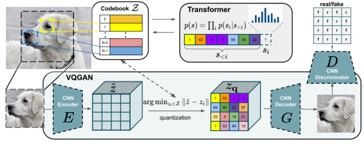 마지막으로 VQ-VAE의 GAN 확장 버전인 VQ-GAN의 구조는 위와 같다. 그림과 같이 VQ-GAN은 VQ-VAE와 거의 동일한 구조를 가지지만 몇가지 차이점이 있다.